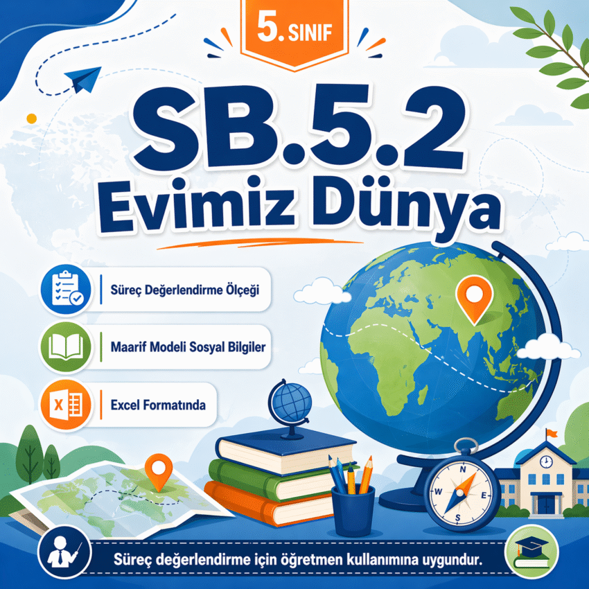 SB.5.2. Evimiz Dünya Süreç Değerlendirme Ölçeği, Maarif Modeli Sosyal Bilgiler Dersi kapsamında hazırlanmış ve öğretmenlerin kullanımına Excel formatında sunulmuş bir değerlendirme aracıdır.